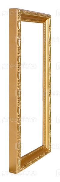 Золотая рамка для картин, зеркал или фото в перспективе, изолированная на белом фоне. Элемент дизайна с обтравочным контуром