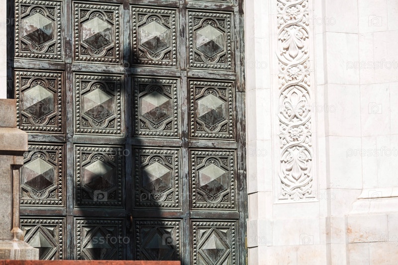 Русский православный собор. Храм Христа Спасителя в Москве. Детали, декоративные элементы на фасаде храма крупным планом. Российская Федерация, Москва