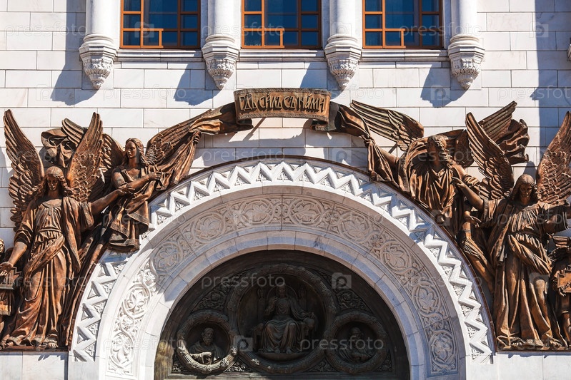 Русский православный собор. Храм Христа Спасителя в Москве. Детали, декоративные элементы на фасаде храма крупным планом. Российская Федерация, Москва