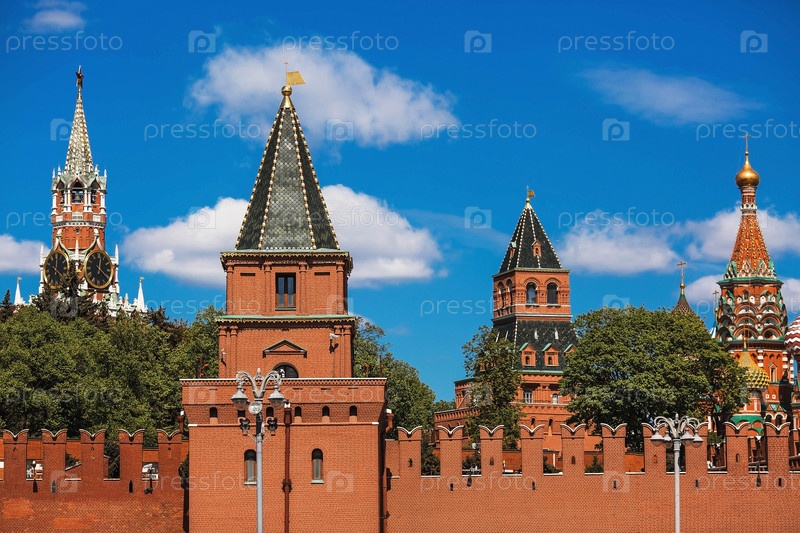 Москва в солнечный день. Петровская Спасская, Константино-Еленинская башни Кремля и собор Василия Блаженного. Вид с набережной