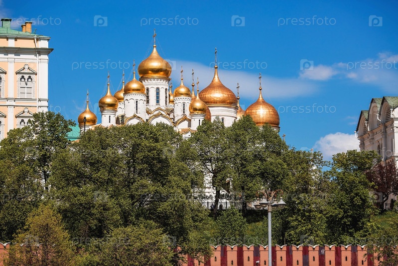 Москва в солнечный день. Большой Кремлевский дворец, Благовещенский собор, Архангельский собор и колокольня Ивана Великого на Кремлевской набережной. Визитная карточка Москвы