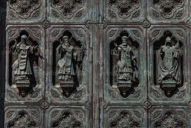 Русский православный собор. Храм Христа Спасителя в Москве. Детали, декоративные элементы на фасаде храма крупным планом. Российская Федерация, Москва