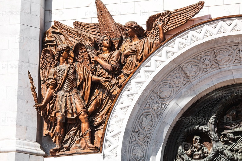 Русский православный собор. Храм Христа Спасителя в Москве. Детали, декоративные элементы на фасаде храма крупным планом. Российская Федерация, Москва