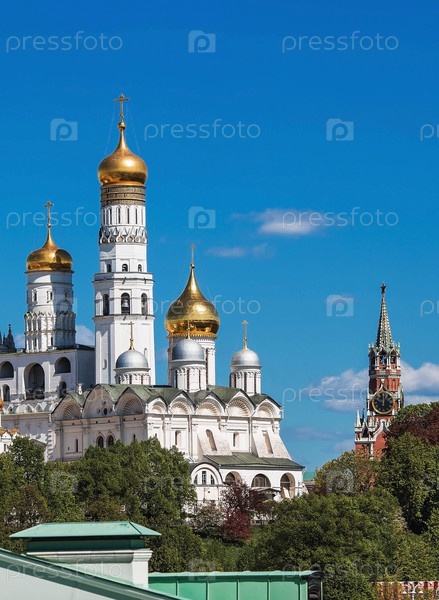 Москва в солнечный день. Большой Кремлевский дворец, Благовещенский собор, Архангельский собор и колокольня Ивана Великого на Кремлевской набережной. Визитная карточка Москвы