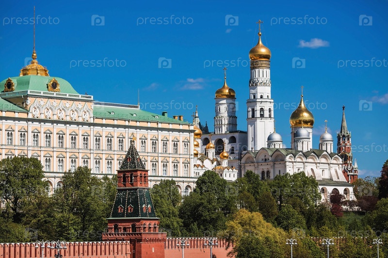 Москва в солнечный день. Большой Кремлевский дворец, Благовещенский собор, Архангельский собор и колокольня Ивана Великого на Кремлевской набережной. Визитная карточка Москвы
