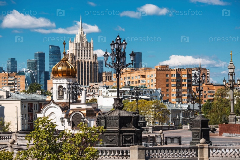Православный собор. Храм Христа Спасителя на фоне здания Министерства иностранных дел и делового центра «Москва-Сити». Российская Федерация, Москва, 28 апреля 2025 года