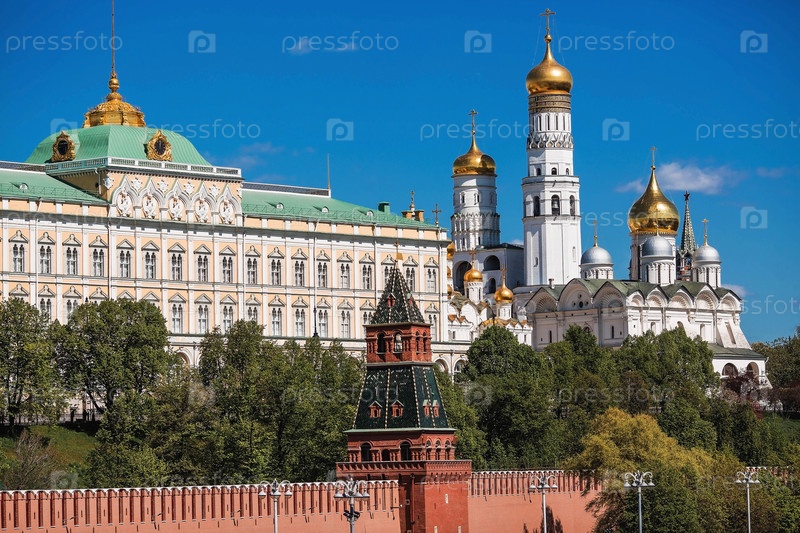 Москва в солнечный день. Большой Кремлевский дворец, Благовещенский собор, Архангельский собор и колокольня Ивана Великого на Кремлевской набережной. Визитная карточка Москвы