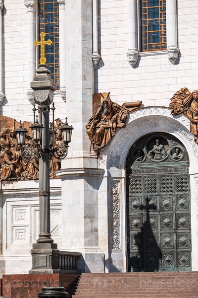 Русский православный собор. Храм Христа Спасителя в Москве. Детали, декоративные элементы на фасаде храма крупным планом. Российская Федерация, Москва