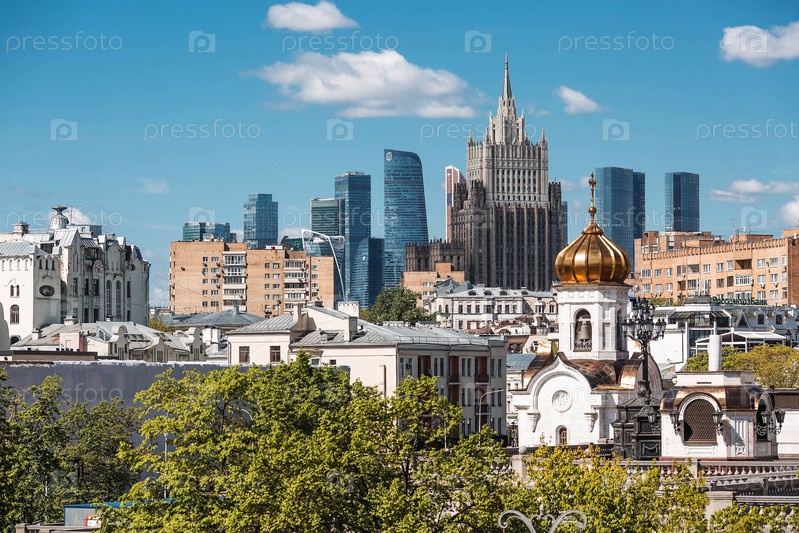 Православный собор. Храм Христа Спасителя на фоне здания Министерства иностранных дел и делового центра «Москва-Сити». Российская Федерация, Москва, 28 апреля 2025 года