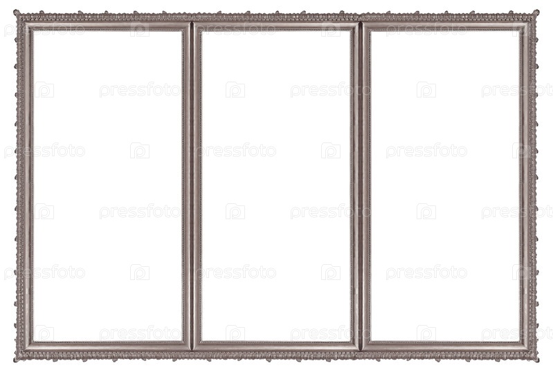 Тройная серебряная рама (триптих) для картин, зеркал или фотографий, изолированных на белом фоне. Элемент дизайна с обтравочным контуром