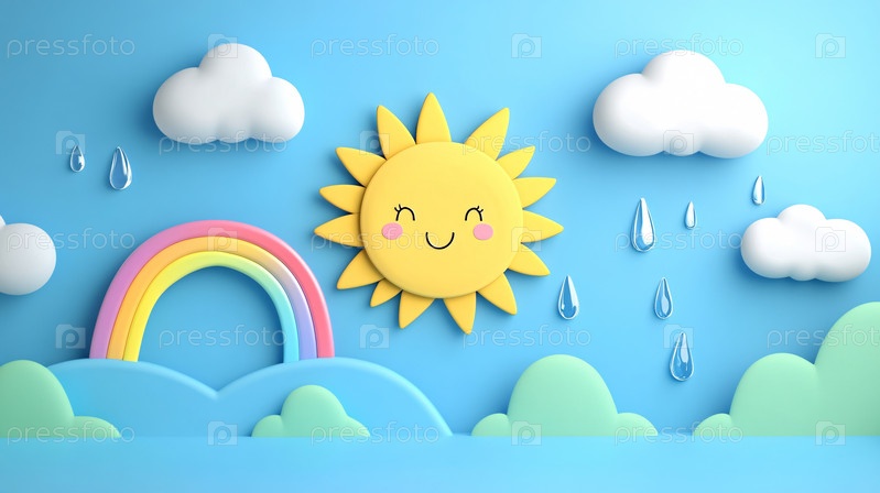На этой веселой иллюстрации изображены улыбающееся солнце, пушистые облака и яркая радуга