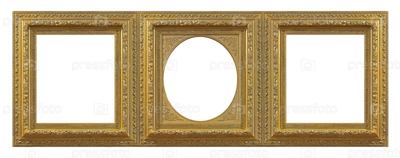 Тройная золотая рама (триптих) для картин, зеркал или фотографий на белом фоне