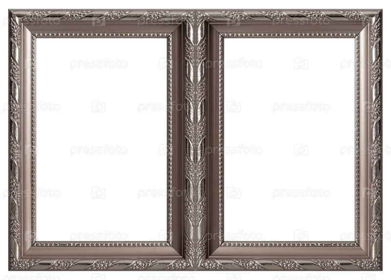 Двойная серебряная рамка (диптих) для картин, зеркал или фотографий, изолированных на белом фоне. Элемент дизайна с обтравочным контуром