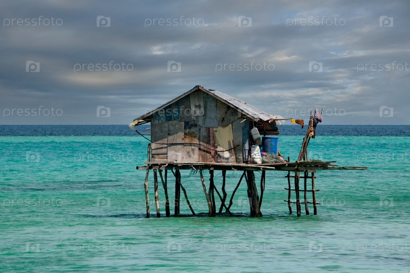 Остров Борнео. Малайзия. 30 ноября 2018 года. Деревня морских цыган на песчаном острове с коралловым рифом. Основным занятием местных жителей является рыбалка и морские сувениры