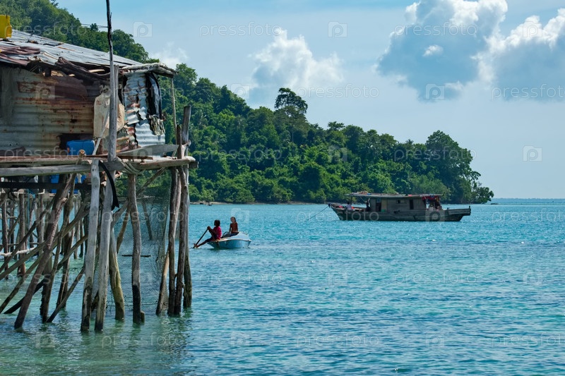 Остров Борнео. Малайзия. 30 ноября 2018 года. Деревня морских цыган на песчаном острове с коралловым рифом. Основным занятием местных жителей является рыбалка и морские сувениры