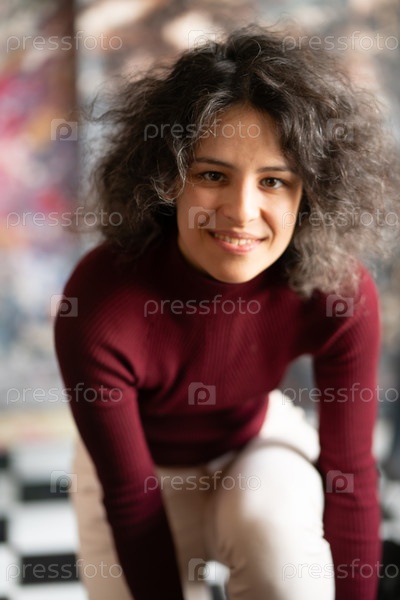 Молодая красивая женщина позирует в красном свитере в студии