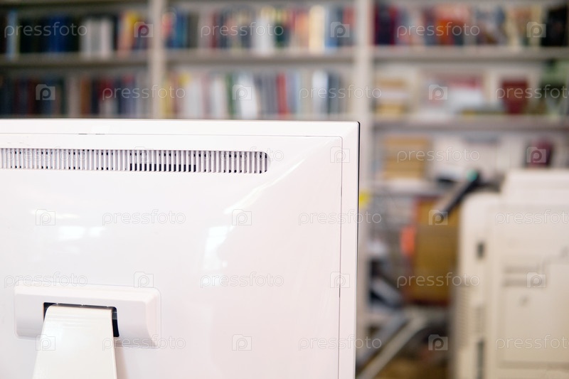 Крупный план белого монитора компьютера в библиотеке с книжной полкой на заднем плане