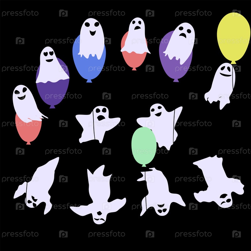 Поздравительная открытка с забавными маленькими привидениями на разноцветных воздушных шарах