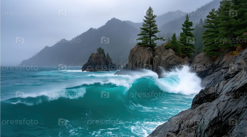 Бурное море у скалистого облачного берега