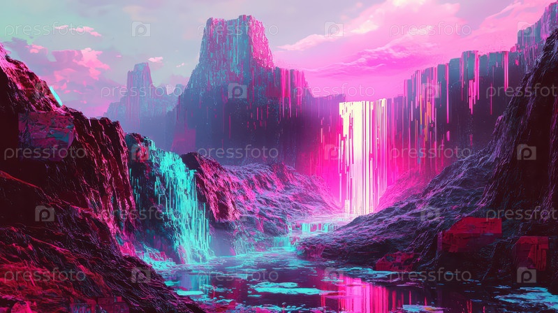 Футуристический неоновый водопад в горах