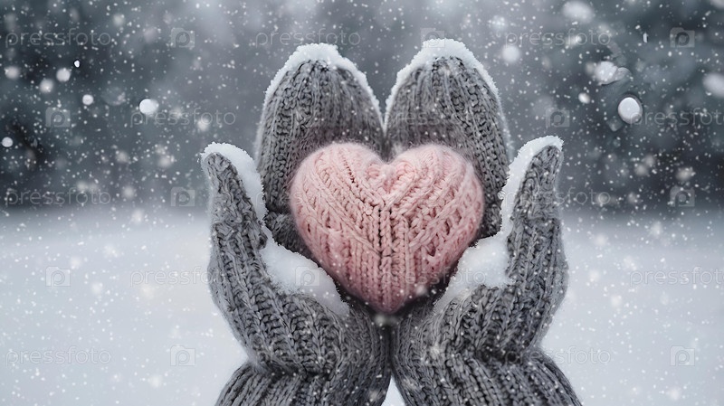 Женские руки в теплых варежках держат розовое сердце. Падает снег. День святого Валентина и Всемирный день здоровья, любви и семейного страхования
