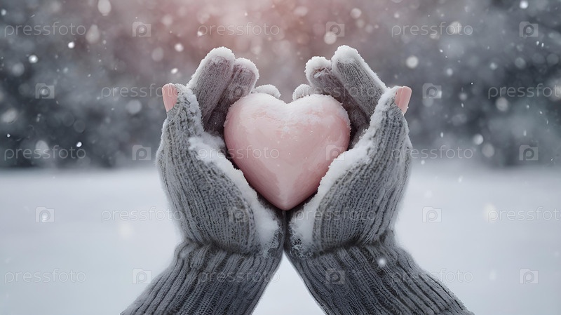 Женские руки в теплых варежках держат розовое сердце. Падает снег. День святого Валентина и Всемирный день здоровья, любви и семейного страхования