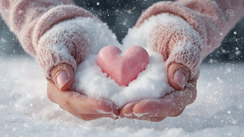 Женские руки в теплых варежках держат розовое сердце. Падает снег. День святого Валентина и Всемирный день здоровья, любви и семейного страхования