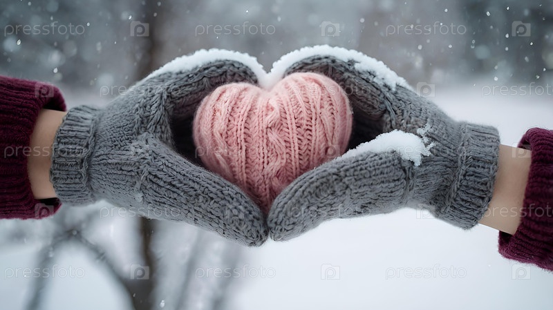 Женские руки в теплых варежках держат розовое сердце. Падает снег. День святого Валентина и Всемирный день здоровья, любви и семейного страхования