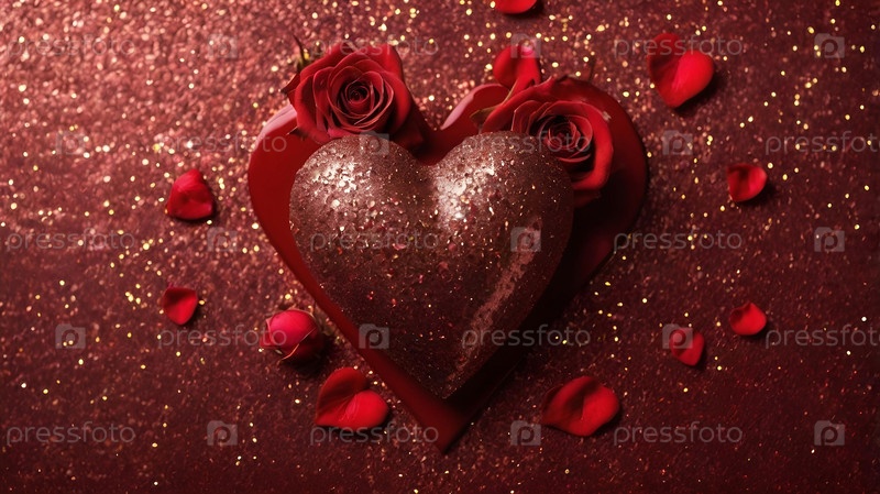 Баннер ко Дню святого Валентина. Красное сердце и розы с праздничными огнями в виде бортика на заднем плане. Макет пригласительного билета на вечеринку ко Дню святого Валентина, место для копирования