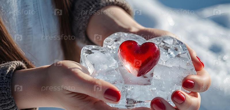 Руки женщины держат кусок льда с красным сердцем внутри. Падает снег. День святого Валентина и Всемирный день здоровья, любви и семейного страхования