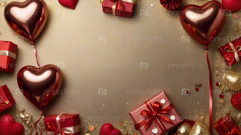 Баннер с подарочной коробкой и красными и золотыми сердечками из фольги на золотом фоне. С Днем святого Валентина. 14 февраля
