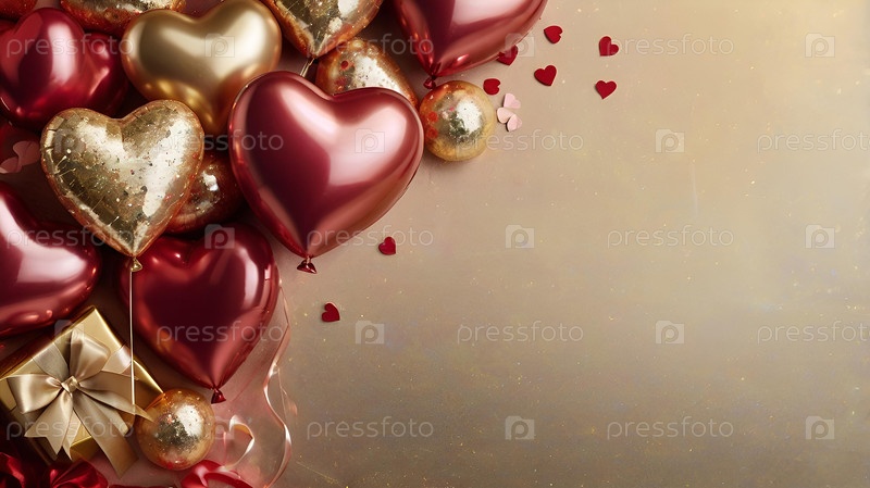 Баннер с подарочной коробкой и красными и золотыми сердечками из фольги на золотом фоне. С Днем святого Валентина. 14 февраля