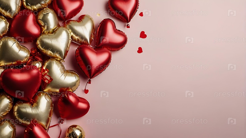 Баннер с подарочной коробкой и сердечками из красной и золотой фольги на розовом фоне. С Днем святого Валентина. 14 февраля