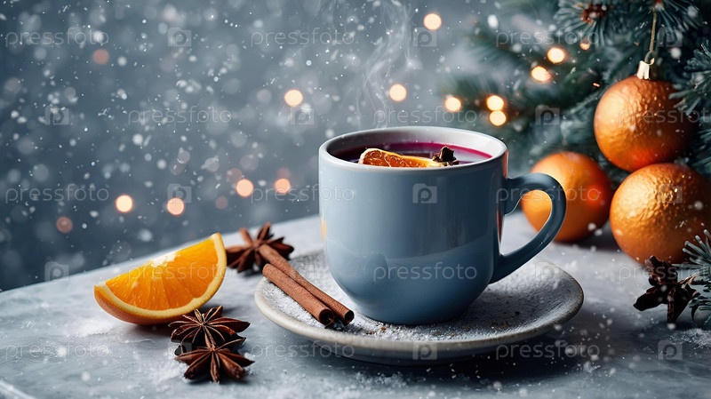 Горячий глинтвейн с цитрусовыми, корицей и анисом. Рождественский глинтвейн со специями и фруктами на столе. Традиционный горячий напиток на Рождество
