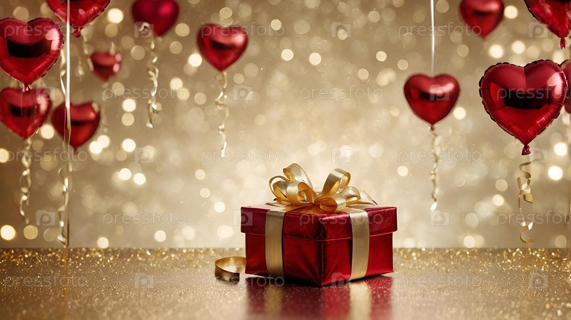 Баннер с подарочной коробкой и красными и золотыми сердечками из фольги на золотом фоне. С Днем святого Валентина. 14 февраля