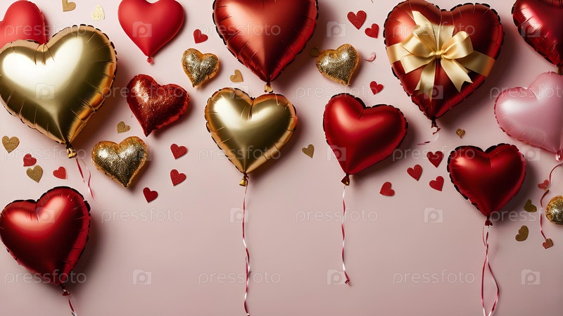 Баннер с подарочной коробкой и сердечками из красной и золотой фольги на розовом фоне. С Днем святого Валентина. 14 февраля