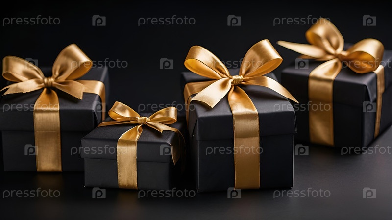 Черные подарочные коробки с золотыми атласными бантами на черном фоне. Стильная концепция для рождественских и зимних праздников 2025 года. Готовим подарки для наших любимых