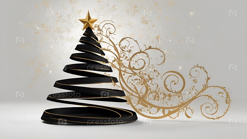 Рождественская открытка 2025. Элегантная черная рождественская елка из черных, белых и золотых закрученных линий с золотой звездой на белом фоне