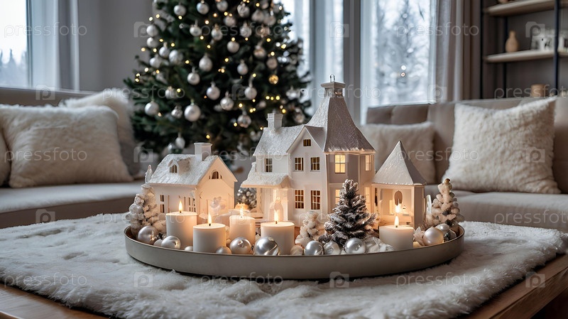 Новый год и Рождество. Скандинавские белые дома, свечи, елки, шишки и игрушки на деревянном столе в домашнем интерьере гостиной. Уютная концепция для праздничного оформления дома