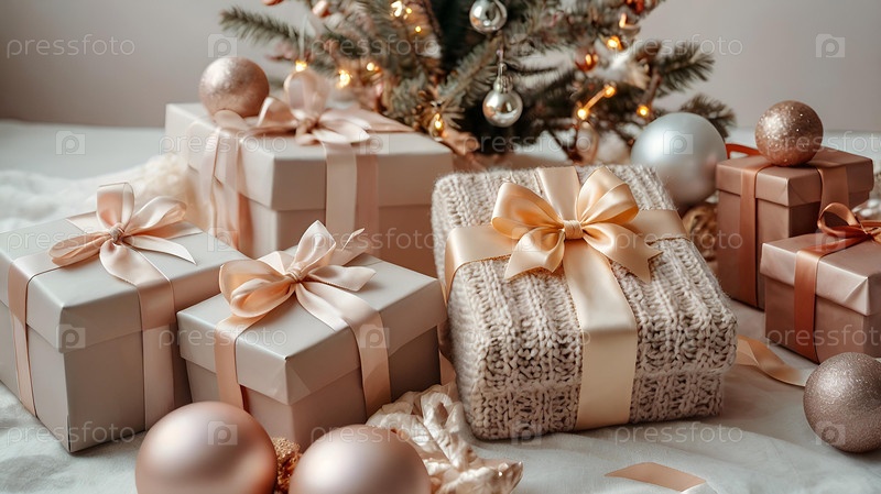 Подарочные вязаные коробки с атласными бантами и еловыми ветками с елочными игрушками. Уютная концепция для рождественских и зимних праздников в 2025 году. Готовим подарки для наших любимых