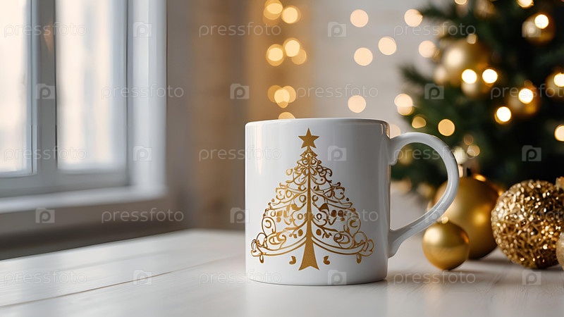 Белая кружка с золотой елкой и золотыми рождественскими украшениями на Рождество. Украшенная рождественская елка и красивое боке на заднем плане