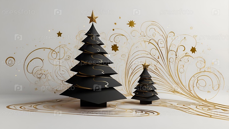 Рождественская открытка 2025. Элегантная черная рождественская елка из черных, белых и золотых закрученных линий с золотой звездой на белом фоне