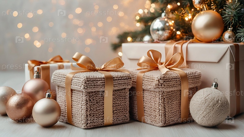Подарочные вязаные коробки с атласными бантами и еловыми ветками с елочными игрушками. Уютная концепция для рождественских и зимних праздников в 2025 году. Готовим подарки для наших любимых