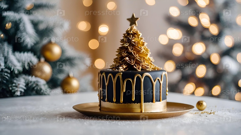 Концепция новогодних блюд. Выпечка. Красивый вкусный торт с елочками на столе. Угощения и сладости на Рождество