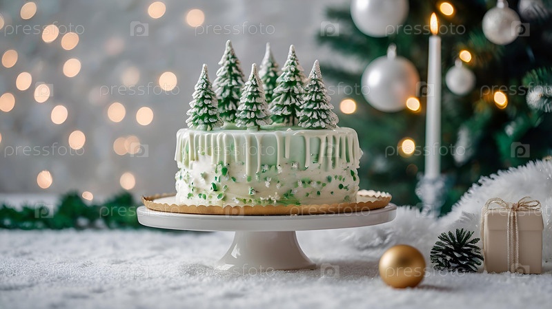 Концепция новогодних блюд. Выпечка. Красивый вкусный торт с елочками на столе. Угощения и сладости на Рождество
