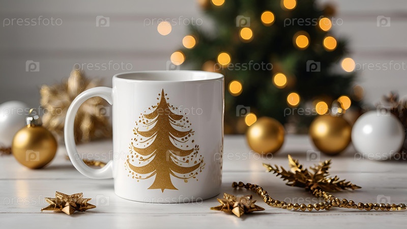 Белая кружка с золотой елкой и золотыми рождественскими украшениями на Рождество. Украшенная рождественская елка и красивое боке на заднем плане