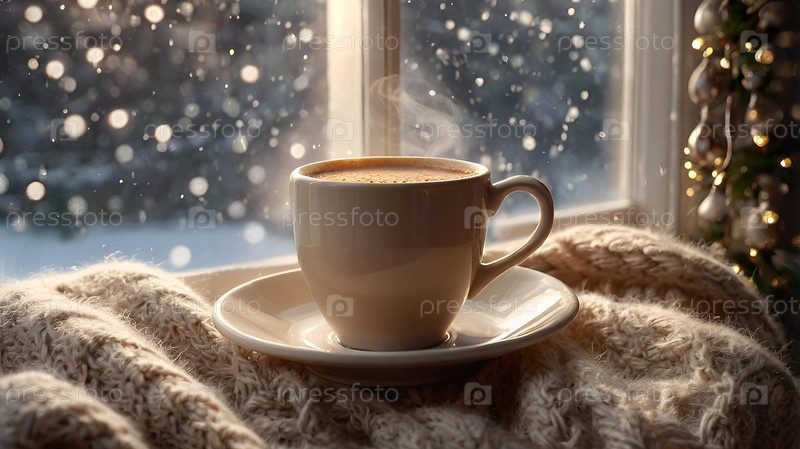Кружка с горячим какао или кофе на зимнем окне. Напиток дымится. Уютное фото в нежных, теплых бежевых тонах. Гармония и уютная концепция Рождества и зимы
