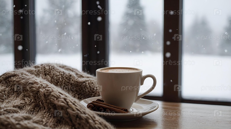 Кружка с горячим какао или кофе на зимнем окне. Напиток дымится. Уютное фото в нежных, теплых бежевых тонах. Гармония и уютная концепция Рождества и зимы