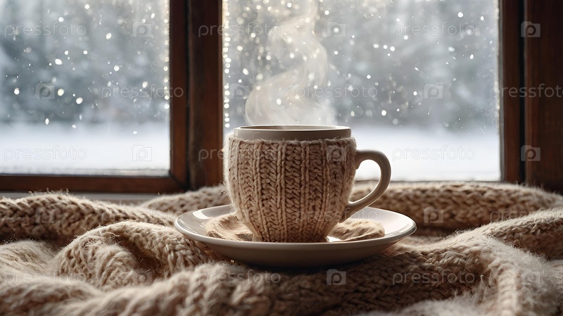 Кружка с горячим какао или кофе на зимнем окне. Напиток дымится. Уютное фото в нежных, теплых бежевых тонах. Гармония и уютная концепция Рождества и зимы