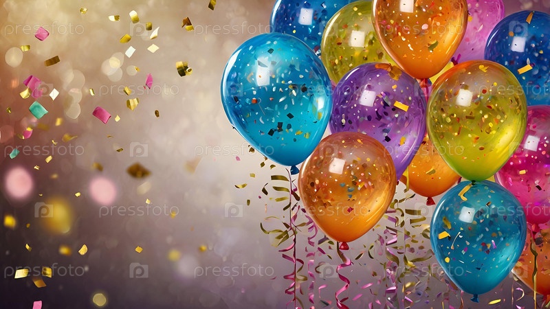 Праздничный фон на день рождения или фон для распродажи с разноцветными шарами и летящим серпантином